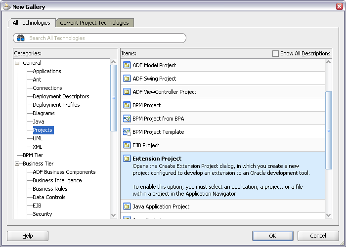 Name the application and create a new Extension project for the application by selecting File -> New -> Projects -> Extension Project
