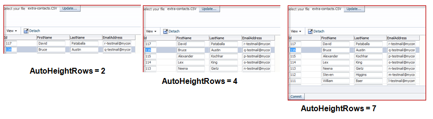 The number of rows used to size the component height. The default value is -1 (no auto-sizing for any number of rows). The height of the component can grow to a maximum of autoHeightRows after which a scrollbar is displayed. A value of 0 can be used to default the autoHeightRows to the current fetchSize. autoHeightRows value cannot be larger than fetchSize attribute. Check in the table component.