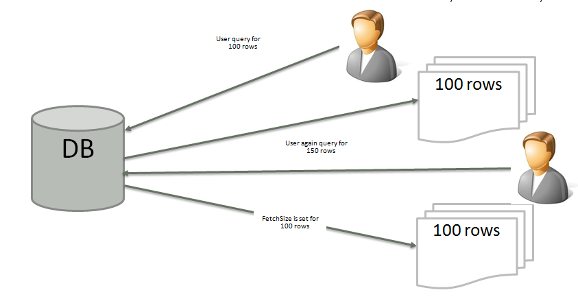 FETCH_AS_NEEDED – will fetch number of rows defined by the RangeSize first and is again fetched upon request. A fetch mode that causes rows to be retrieved from a JDBC result set as the user navigates through the row set. The result set is closed when the user reaches the end of the row. The executeQuery() will fetch this much only.