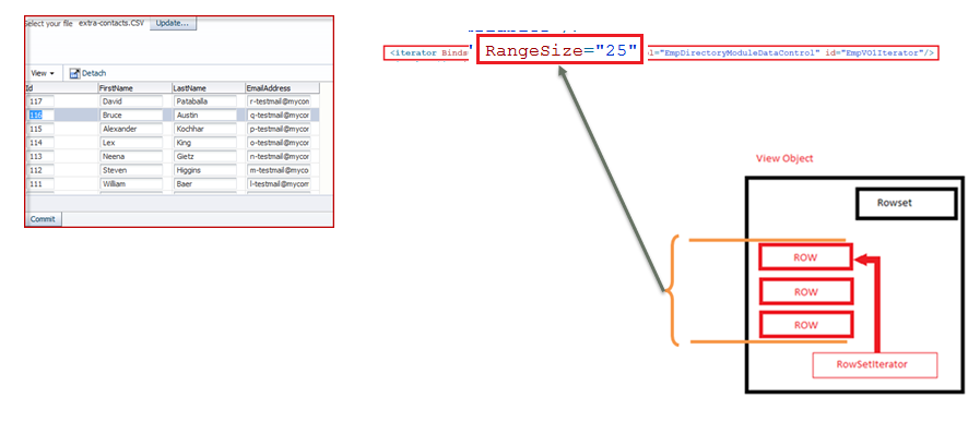 Number or rows to be displayed in the Iterator collection. Table rows maps to this. By default is 25. Maps from View Object to the UI Collection. Check in VO, Page definition file for this property.