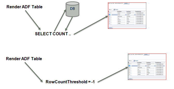 Specify a value to determine if a result set returns the number of rows you specify as a value. If you set RowCountThreshold to 0, the Iterator returns the estimated row count in the result set by executing the count query. If you set RowCountThreshold to less than 0, the Iterator does not execute the count query. If RowCountThreshold is set to -1 then it will load the table faster and will not execute the SELECT COUNT query for the number of data retrieved. Check in page definition file.